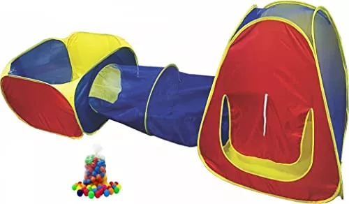 O design permite que crianças de 1 a 8 anos rastejem pelo túnel, brinquem na piscina de bolinhas e se divirtam dentro da tenda, que é espaçosa para até três crianças.